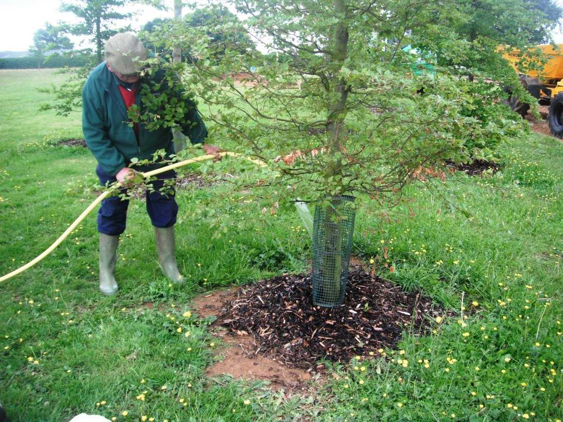 В центр ямы помещается колышек для поддержки саженца, который размещается рядом и засыпается смесью, приготовленной ранее, после чего саженец поливается водой.