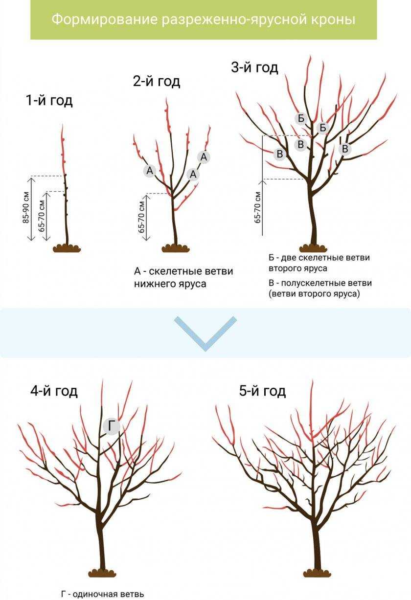 На второй год роста растения необходимо все побеги укоротить на 1/3 их длины, при этом центральный проводник должен быть на 30 см выше, чем ближайшие скелетные ветки. Садоводы не рекомендуют на дереве оставлять несколько побегов, рост которых начинается из одной точки.