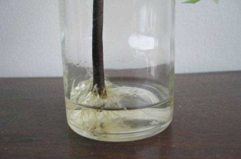 Черенки заготавливают весной. Подбирают хорошо развитые, с вызревшей древесиной, и минимум 3 почками экземпляры. После обрезки 24 часа черенки выдерживают в растворе «Корневина» (1 ч. л./1 л воды). Затем перемещают в чистую воду и ждут прорастания корней. Меняют воду в сосуде раз в 3 дня, добавляя по 0,5–1 таблетке активированного угля и по 1 капле перекиси водорода. Когда черенок даст корни, проводят посадку в торфяной горшок. Уже весной саженец можно будет высадить в открытый грунт.