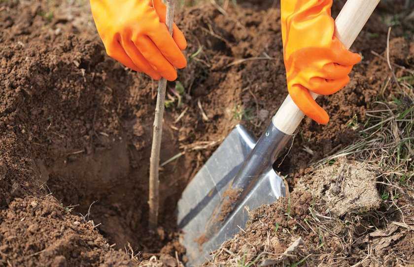 - Из подготовленной с осени лунки выбирают землю и откладывают в сторону.