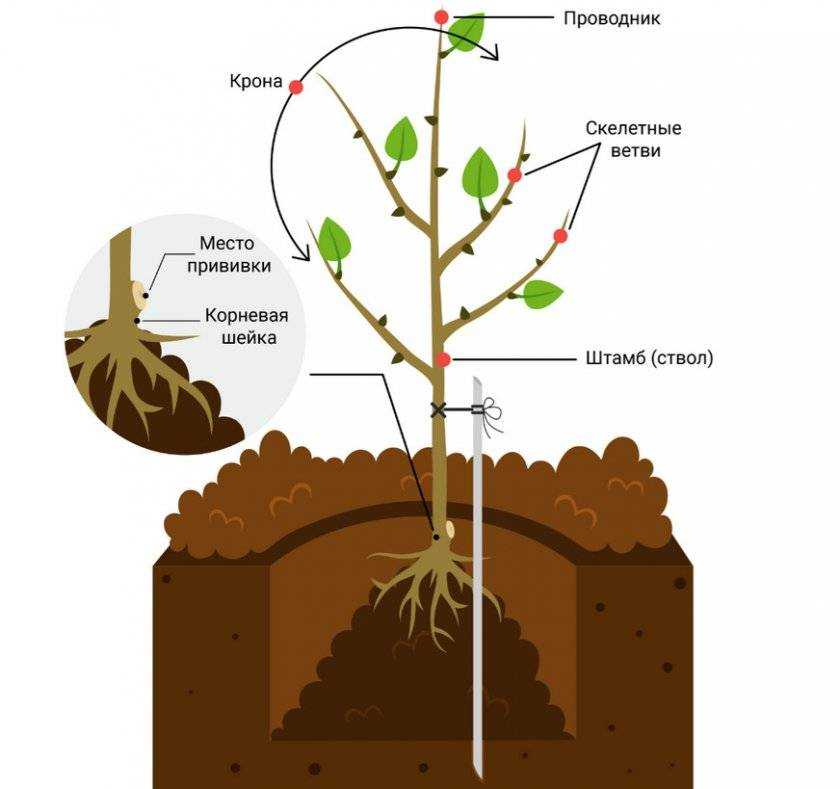 - Оставшейся землёй засыпают корневую систему до уровня корневой шейки (таким образом, место прививки будет располагаться ещё выше уровня почвы).