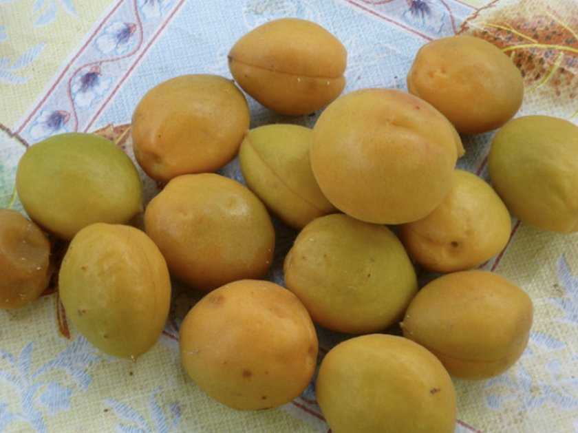 Плоды крупные, массой 70-100 г, овальные, слегка приплюснутые со стороны плодоножки, привлекательные. Кожица оранжевая, с небольшим пятнистым румянцем, покрывающим до 20% плода. Мякоть оранжевая, у косточки светлее, вкусная, с легким ароматом. Косточка среднего размера, овальная, округлая, легко отделяется от мякоти.