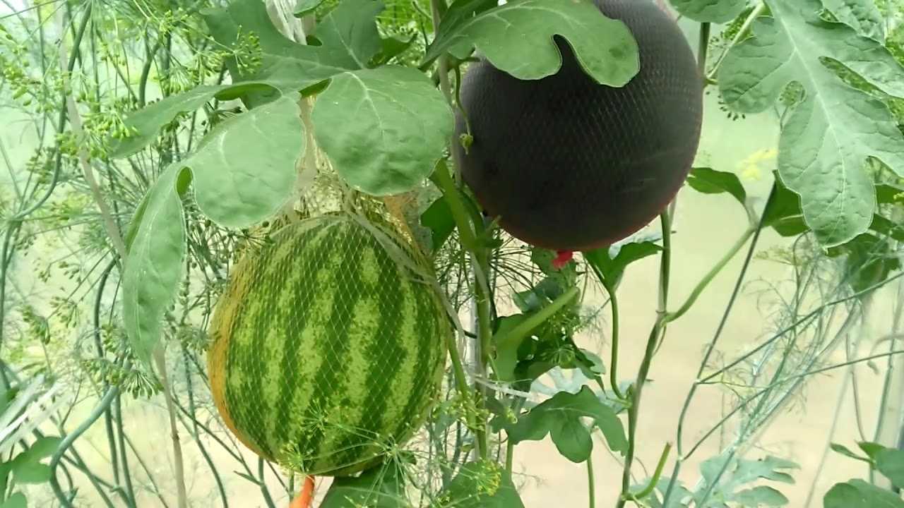 Сетки, укреплённые на шпалере, позволяют арбузам не упасть и лучше созреть