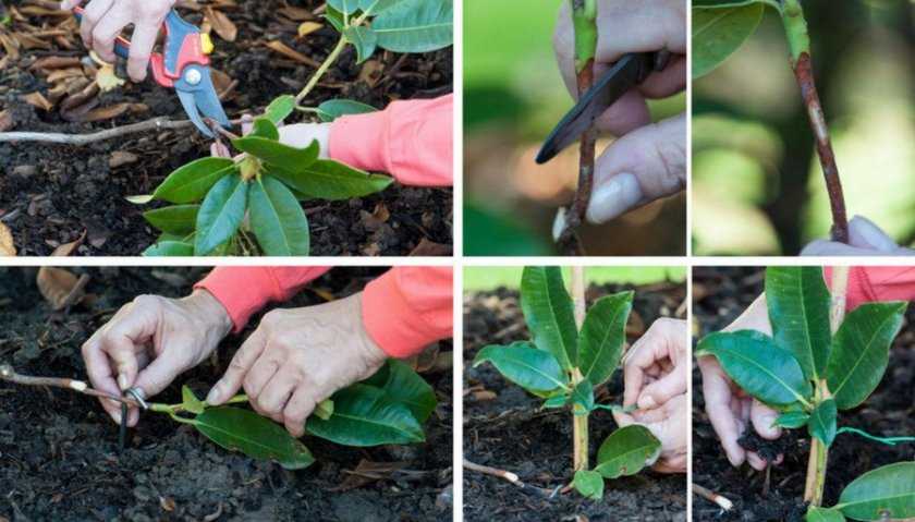 Подыщите наиболее подходящую ветку, которая будет располагаться максимально низко к земле и сделайте на ней небольшой надрез. Этот стебель необходимо уложить в специальную лунку, закрепить ее при помощи проволоки ну и, конечно же, засыпать торфом. Землю, где находится отводок необходимо постоянно увлажнять, что позволит корням, появится уже к осени. Дождавшись весны, отделите будущий куст от маточного рододендрона и высадите на участок, где он будет постоянно расти.