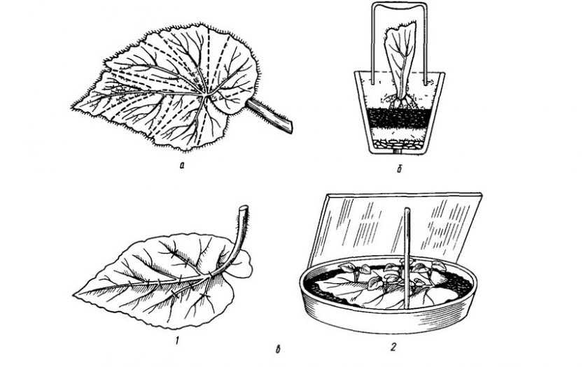 а — схема нарезки черенков из листа, б — укоренение листового черенка, в — размножение бегонии широколистной целым листом; 1 — нарезы жилок с нижней стороны листа, 2 — образование молодых растений в надрезах жилок