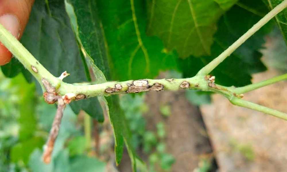 Когда возникает антракноз винограда, на листьях появляются некрозы в виде мелких круглых пятен с коричнево-черной каймой. Эти пятна постепенно сливаются, а иногда они могут оставаться одиночными. Сухие пораженные участки часто выпадают из зоны поражения, за счет чего листовая пластина становится «продырявленной». Больше всего подвержены инфицированию молодые листья. На побегах антракноз у винограда приводит к продольному растрескиванию коры и может заглубляться до сердцевины. Побеги становятся хрупкими, при этом края повреждений чернеют и становятся приподнятыми.