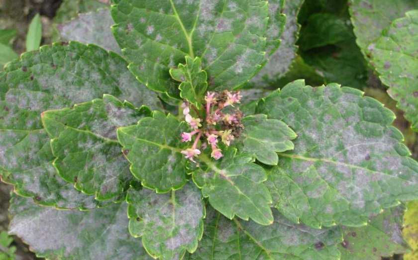 Опасное заболевание гортензии, которое может привести к её гибели. Как правило, оно поражает растение, ослабленное переизбытком азотистых удобрений или плохим поливом. Верные его признаки — бледные желтоватые пятна на листьях, при этом с обратной стороны образовывается серый или фиолетовый налёт.