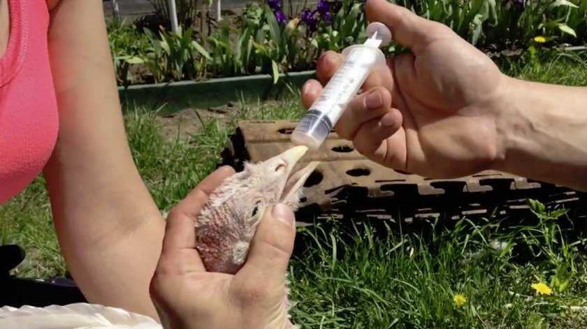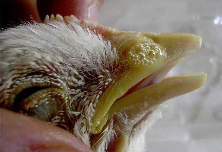 - появляются слизистые белёсые ниточки, когда птенец открывает клюв;