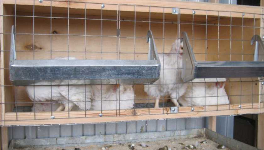 - кормушки — при клеточном содержании простым решением является корыто, общее на несколько клеток, где напротив каждой из них засыпается корм; при зальном содержании никуда не деться от общих кормушек различных конструкций;