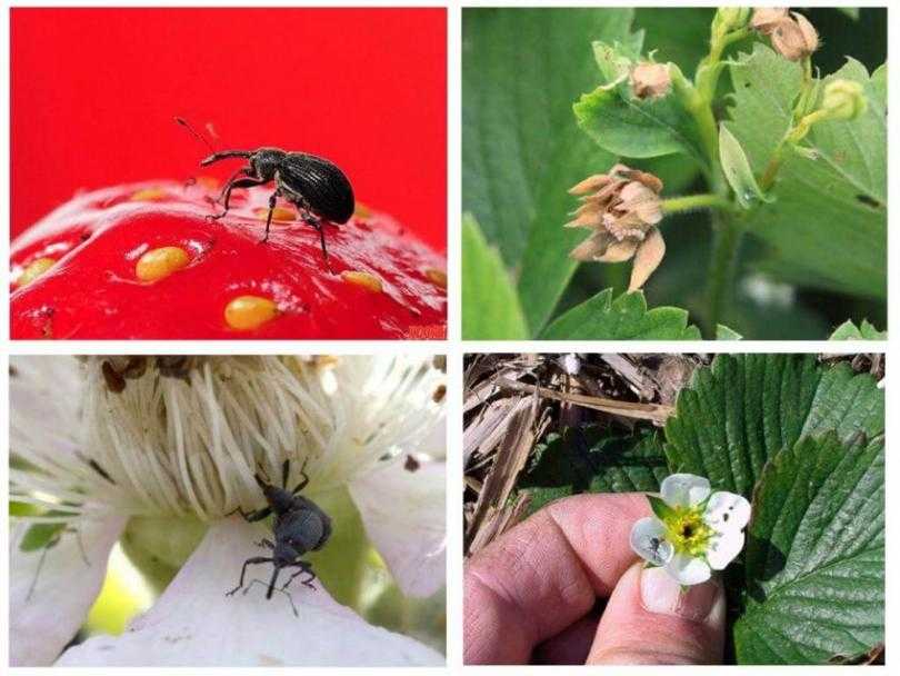 Насладиться сладкой клубникой любим не только мы, но и всевозможные вредители. Например, долгоносик. Это жук длиной примерно 2-3 миллиметра. Своё название он получил от удлинённого хоботка, которым он портит клубнику, поедая её. Личинки хоботка белые, как и куколка, но затем, после окукливания, тело начинает чернеть и после взросления, насекомое полностью имеет чёрный окрас. Начинает вредить урожаю когда начинаются тёплые весенние дни (примерно в начале мая). Хорошо прогретая почва, комфортная температура, солнце — всё это идеальные условия для проживания насекомого на вашей клубнике.