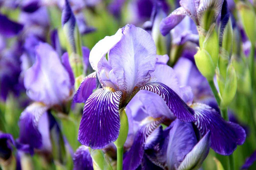 Iris означает «радуга» в переводе с греческого. И действительно, в саду заросли ирисов создают великолепную цветовую гамму (на фото). Правильно подобранные сорта с разными сроками цветения позволяют наслаждаться цветами касатика на протяжении всего лета.