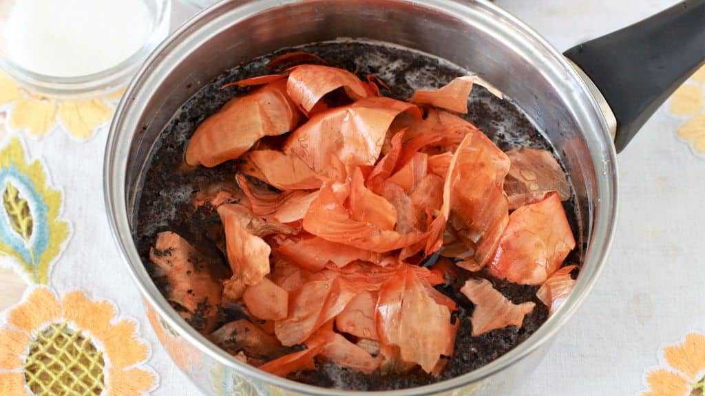 - В 10-литровое ведро засыпьте 100-150 г сухой луковой шелухи, залейте емкость доверху водой.