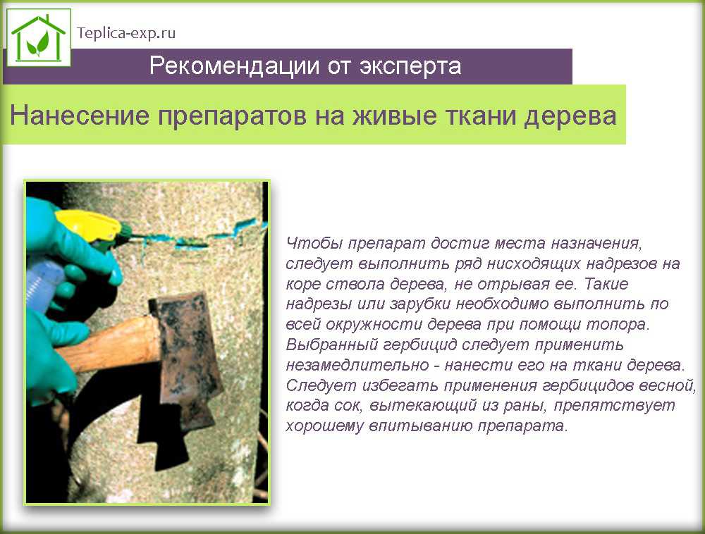 Способ 1: нанести на живые части. Для этого полагается сделать несколько сколов топором на стволе. Такие зарубки должны располагаться по кругу. На них сразу же придется нанести препарат. Не стоит использовать этот прием весной, так как из-за обильного движения сока препарат большей частью будет вымываться из ран.