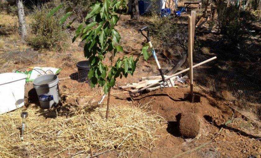 Яма для посадки черешни должна быть около 80 см в диаметре и около полуметра в глубину. Подготовить ее можно еще осенью. Из удобрений при посадке нужны перегной и зола. Они могут составлять половину почвосмеси, в дальнейшем саженцу будет чем питаться.