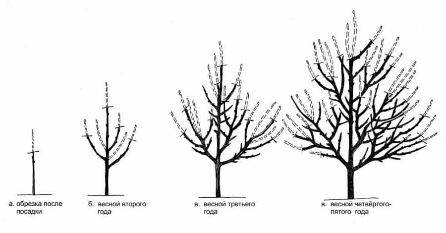 На четвертый год формируют второй ярус по тому же принципу. При обрезке дерева вырезают под основание молодые ветки, не участвующие в формировании. Места срезов обязательно обрабатывают садовым варом.