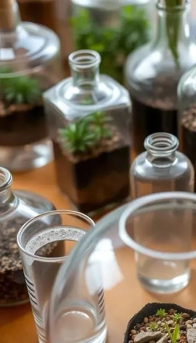 - Флорариумы в различных емкостях: Флорариумы можно создавать в стеклянных банках, вазах, аквариумах, колбах и даже в старых лампочках!