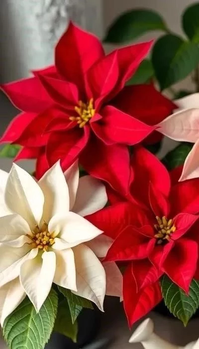 Для любителей более нежных оттенков существуют сорта с белоснежными прицветниками, такие как ‘White Wonder’ и ‘Avalanche’. Розовые сорта, например, ‘Pink Champagne’ и ‘Visions of Grandeur’, добавляют романтичности в интерьер. А для тех, кто предпочитает оригинальность, выведены пестрые сорта, сочетающие в себе несколько оттенков, например, ‘Marble’ с кремово-красными разводами или ‘Winter Rose’ с розовыми прицветниками и белыми краями.