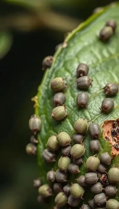 Фото 1: Яйца щитовки – мелкие, овальные, обычно располагаются под щитком взрослой самки или на листьях.