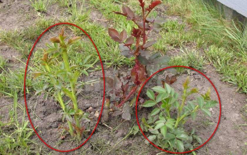 - если на подвое остались собственные почки: при этом вместе с розовыми побегами будут развиваться и побеги шиповника, а со временем более выносливый родственник может полностью подавить рост привитой культуры;