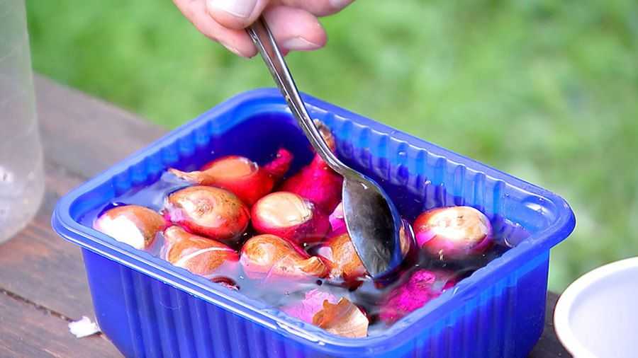 Перед тем как высаживать луковицы тюльпанов, их нужно протравить. Процедура защитит посадочный материал от многих болезней. Проще всего обеззаразить луковицы, опустив их на 30 минут в розовый раствор марганцовки.