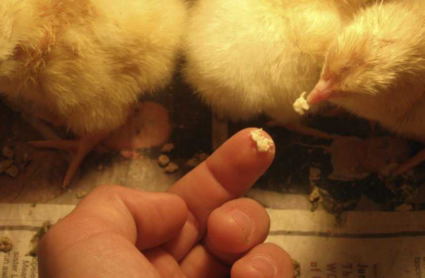 Первые несколько часов после вылупления не следует давать птенцу пищу. Это время необходимо для обсыхания. К тому же, не менее 24 часов способен прожить цыпленок на запасах из желточного мешка. Поэтому голодание в течение нескольких часов полезно для быстрого рассасывания остатков желтка.