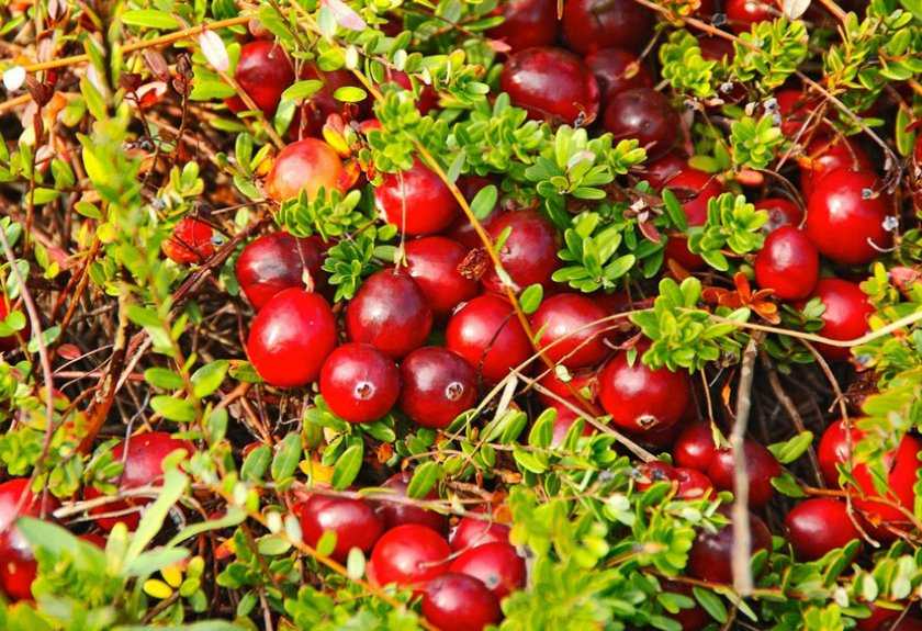 - Плодовые кустарники. Эта категория отлично сочетается с голубикой, а именно различные сорта брусники, черники, клюквы и смородины, а также допустимо сажать в саду малину, которая сможет плодоносить и на слабокислых почвах.