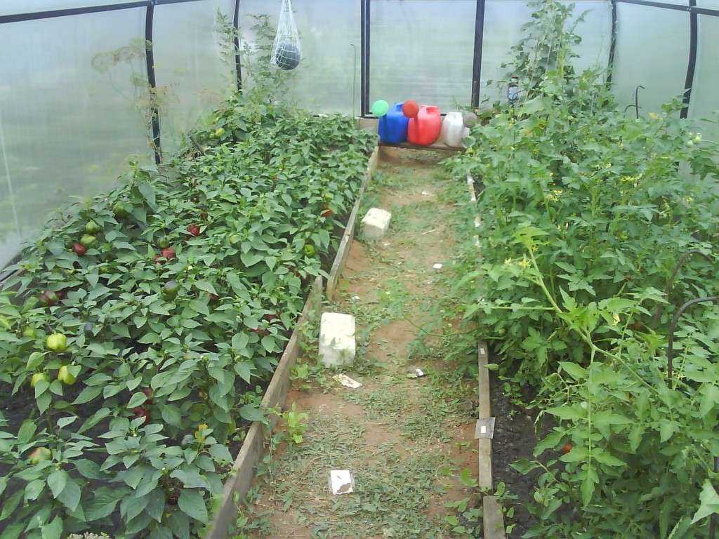 Можно обойтись и без натягивания пленки, для этого нужно распределить территорию, учитывая индивидуальные особенности выращивания каждого овоща. На фото ниже можно увидеть, как в теплице правильно посадить вместе перец, томаты и огурцы.