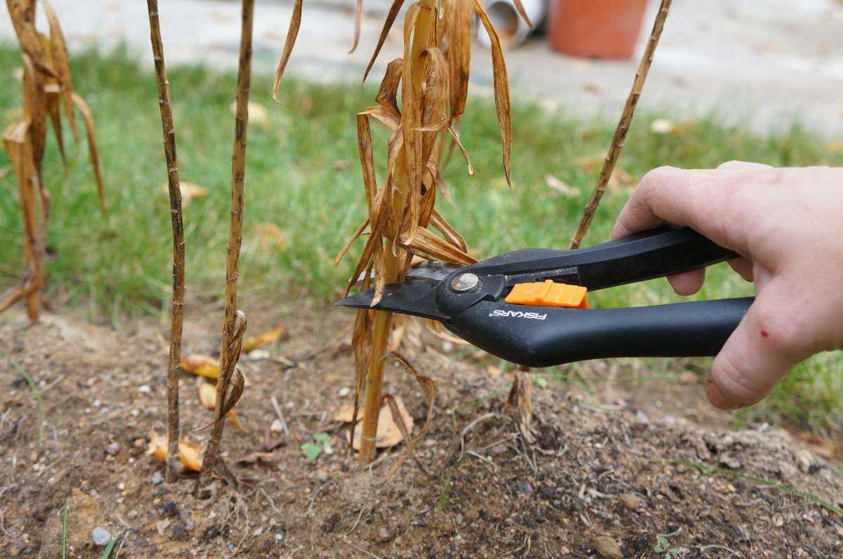 Чтобы подготовит растение к зиме, его нужно обрезать, но только после полного высыхания. Оставить следует стебель высотой 10-15 см, все остальное обрезать острым ножом или секатором.