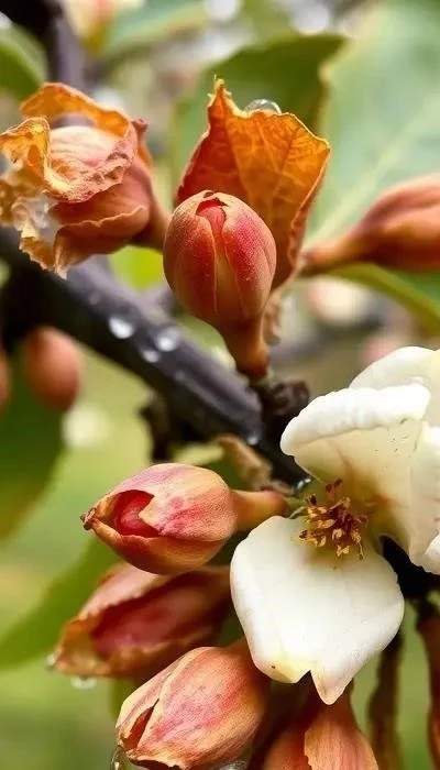 Симптомы монилиоза проявляются по-разному в зависимости от стадии развития болезни и пораженной части дерева. На начальной стадии, во время цветения, наблюдается внезапное увядание и побурение цветков. Они становятся мягкими и быстро опадают, часто не успевая завязаться в плоды. Это один из первых признаков, на который стоит обратить внимание. Пораженные цветки могут выделять капельки липкой жидкости, содержащей споры грибка.