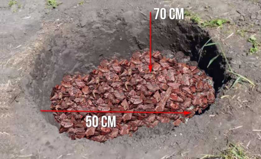 Кроме того, перед закладкой почвенной смеси в яму необходимо насыпать надёжный для обеспечения хорошего дренажа слой щебня, битого кирпича или гравия — минимум 15 см. С учётом этого правила глубина посадочной ямы должна составлять не менее 70 см. Ориентировочный диаметр — 50 см, хотя в целом следует ориентироваться на объём земляного контейнера, в котором продаётся саженец, и увеличивать этот размер примерно в два раза.