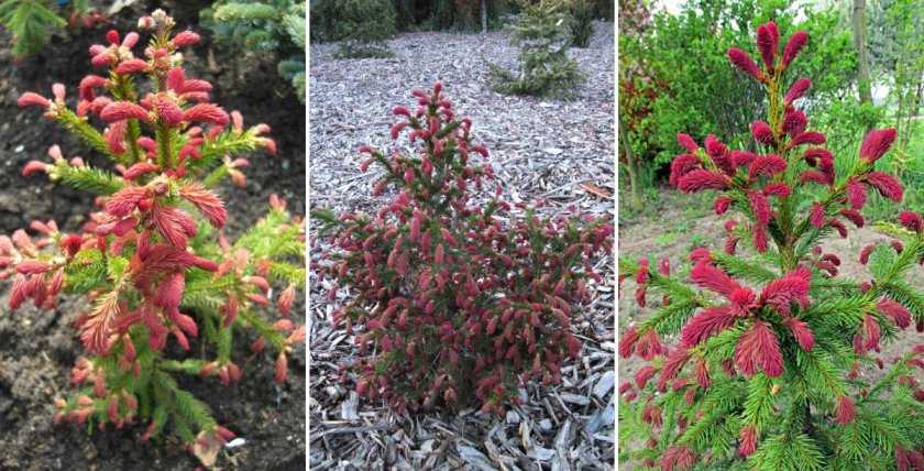 В десять лет её высота всего лишь метр. Окрас хвои очень необычный. Молодые иголки, по весне, насыщенно красного цвета. Через пару дней они становятся красно-бордовыми. Такой красотой ель радует глаз не долго, недели три. Длина иголок 3 см.