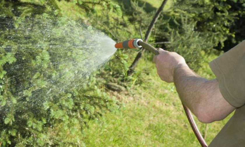 Полив. Увлажнять почву нужно обильно, но не очень часто, чтобы не допускать, с одной стороны, застоя воды, с другой — пересушивания корней из-за поверхностного и неглубокого полива. Периодичность процедуры зависит от исходного состояния земли (чем тяжелее почва, тем реже её нужно поливать) и текущих погодных условий. Одновременно с поливом можно проводить дождевание, при этом очень полезно добавить в воду немного хелатина — специального жидкого удобрения для хвойников, от которого иголки приобретают более насыщенный цвет и здоровый блеск.