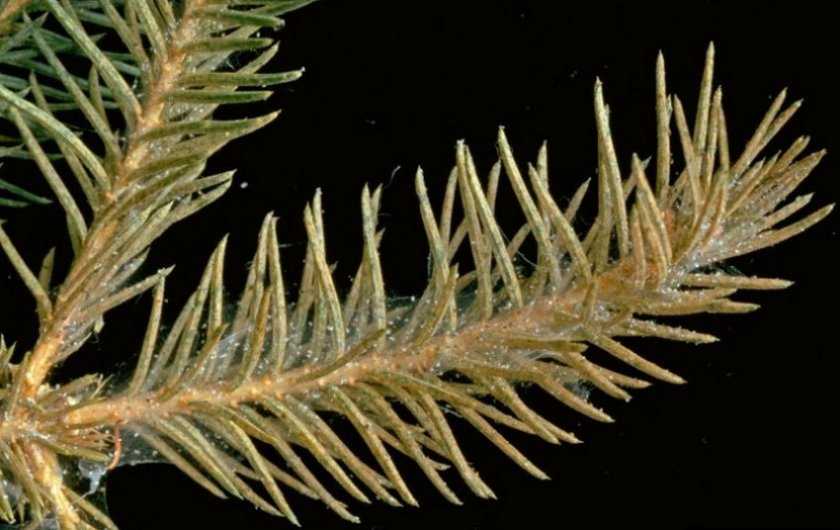 - Еловая листовёртка оплетает крону паутиной, а её личинки поедают зелень. Бороться с этим вредителем следует путём обильного опрыскивания побегов мыльным раствором.