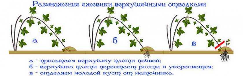 Выбрать длинные побеги (около 40 см), пригнуть их вниз и зарыть в ямки. Обычно к началу нового сезона отводки укореняются и дают собственные побеги. Когда из длина достигнет 12–15 см, молодой куст можно отделять от основного.