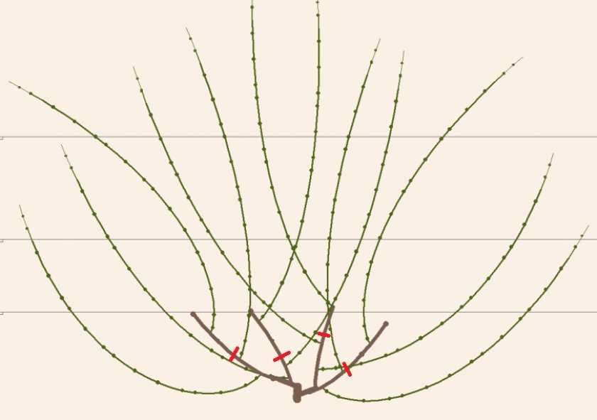 Весной шестого года начинается формирование плодовых стеблей. Для этого нижний побег обрезается на 2 — 3 глазка.