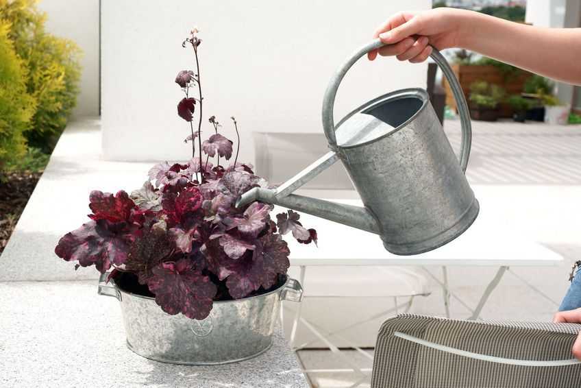 В теплое время года гейхеры поливают 3–5 раз в неделю. В жару и при отсутствии дождей лучше увлажнять грунт ежедневно утром или после захода солнца.
