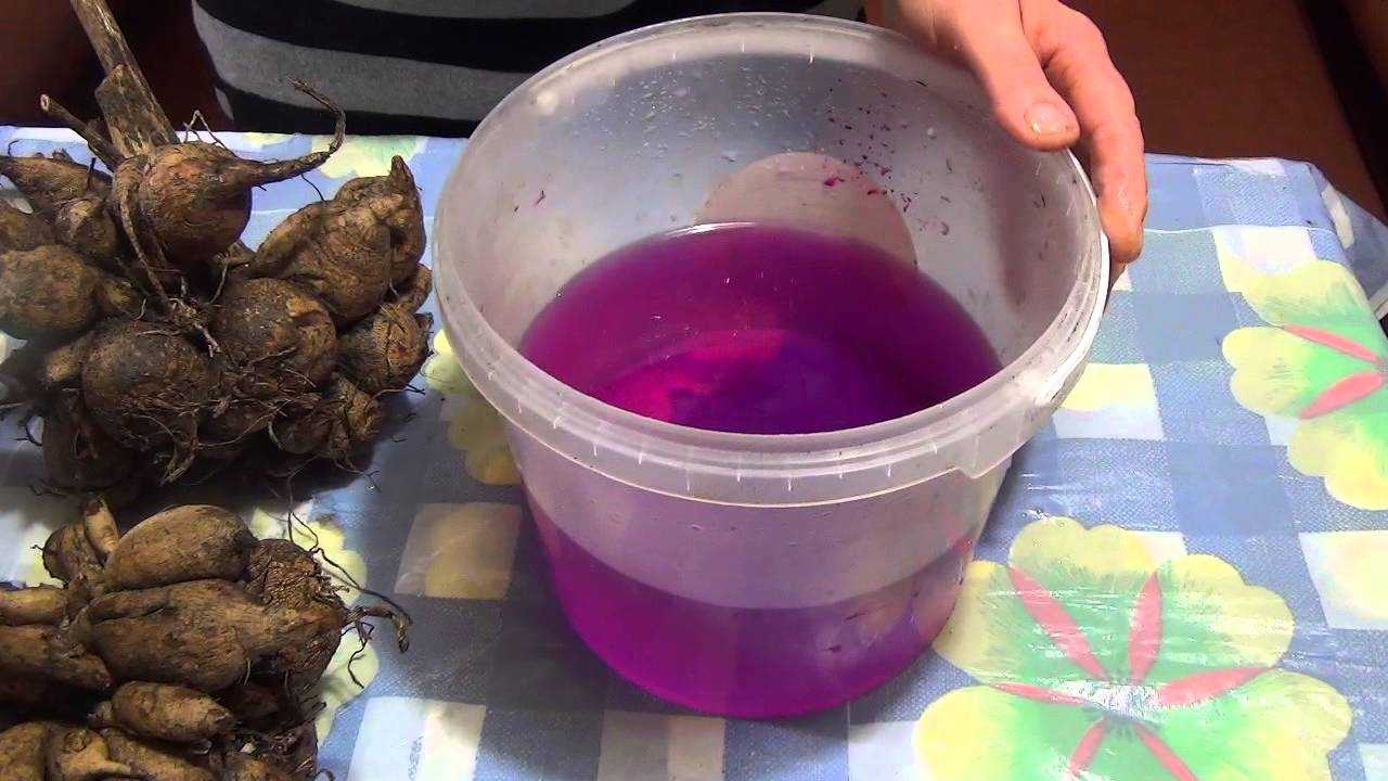 Вначале емкость с клубнями стоит поместить в помещение с температурой +8 градусов. Влажность воздуха должна составлять 80 %. Затем клубни стоит очистить от грунта, убрать корешки и присыпать срезы измельченным углем.