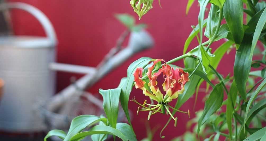 В комнатном цветоводстве эта красавица представляет не такое уж представительное семейство Мелантиевых (Melanthiaceae). Перевод латинского названия gloriosa — «цветок славы» — сполна отображает великолепие этой вьющейся лианы родом из Азии и Южной Африки. Не менее популярны, чем официальное название растения, и народные прозвища — лилия славы, лазающая лилия, лилия пламени.