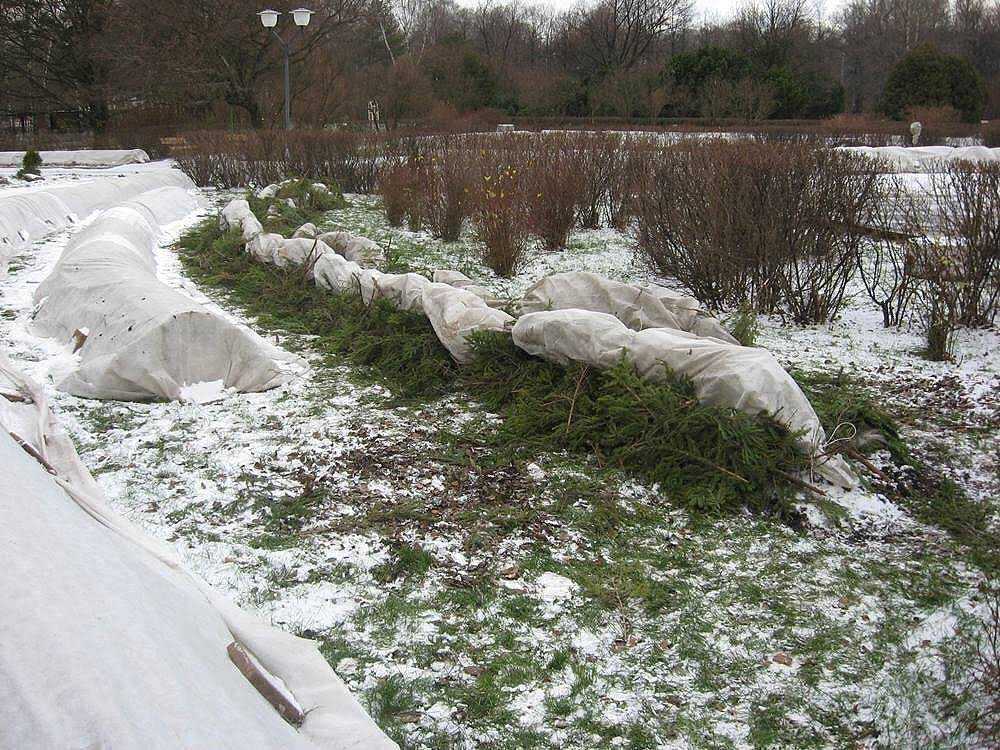 Предварительно до накрытия цветов от заморозков удаляют бутоны, листья, зеленые верхушки стеблей. Во время первых холодов кусты прикапывают землей. Стебли нагибают к земле и закрывают еловыми ветвями или листвой. Лучше всего использовать сухое укрытие растений. Чтобы его сделать: