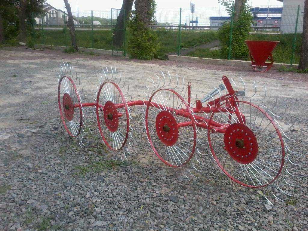 Существует 5-колесная модификация граблей. Она имеет 3,7 метра в длину. Колеса расположены в косом положении. Это увеличивает эффективность ворошения сена и ускоряет работы. При этом потерь в процессе сгребания нет. Производительность мотоблока, оснащенного этими граблями, – от 1,5 до 2,5 гектара в час. Вес устройства – 140 кг.