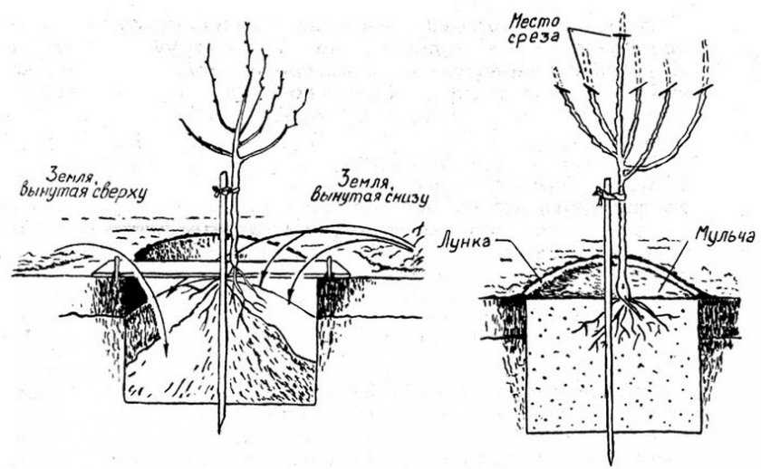 Глубина лунки под посадку должна составлять около 80 см с диаметром 1–1,2 м. Расстояние между молодыми саженцами должно быть не менее 2 м.