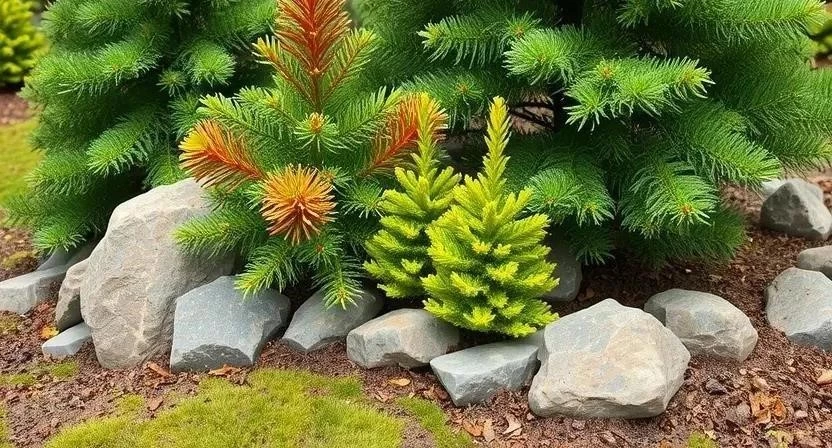- Использование контрастов форм и текстур: сочетайте растения с разной формой кроны и текстурой хвои.