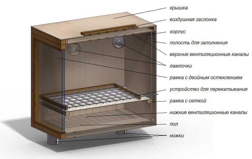 Размеры следует рассчитывать так, чтобы между стенками внутри и лотками с яйцами было не менее 5 см – это расстояние необходимо для обеспечения нормального воздухообмена. Вверху желательно сделать небольшое открывающееся окно. Оно необходимо для дополнительной вентиляции.