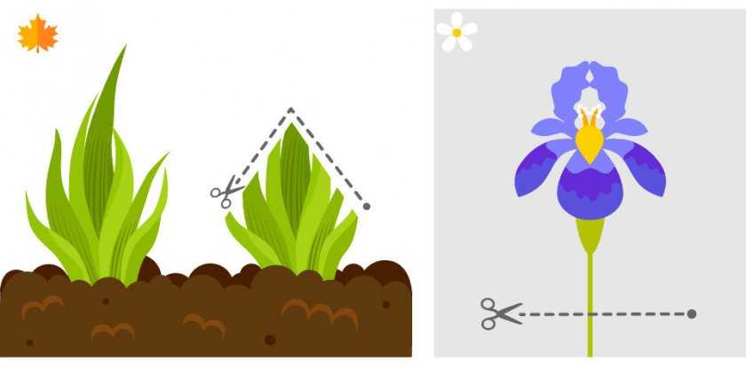 Отцветшие цветоносы у ирисов удаляют почти сразу после окончания цветения. Листву же срезать не рекомендуется до тех пор, пока она сама не завянет. В зелёной наземной части продолжаются процессы фотосинтеза, способствующие накоплению питательных веществ в корневищах, поэтому убирать её нельзя.