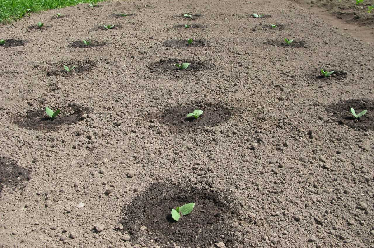 На подготовленном с осени участке при температуре грунта выше +15 градусов проводят посев семян. Лунки должны быть глубиной 5-6 см. После того как грядка посеяна, ее рекомендуется полить теплой водой и замульчировать. Для появления ранних и дружных всходов грядку можно накрыть агроволокном. После появления первого настоящего листочка из каждой лунки удалить слабое растение, а оставшийся кустик окучить.