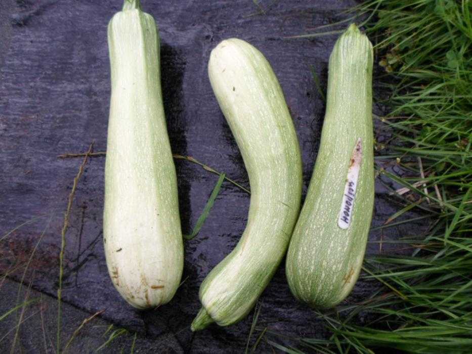 - «Белый» – один из наиболее быстрых по созреванию кустовых сортов кабачков. Фактическая зрелость плодов наблюдается с 35-го дня. Вес каждого плода до 1 кг, внешне они светлые с легким зеленоватым оттенком. Использование универсальное, рекомендуется для детского питания и для людей, болеющих сахарным диабетом. Хранится не менее 1 месяца.