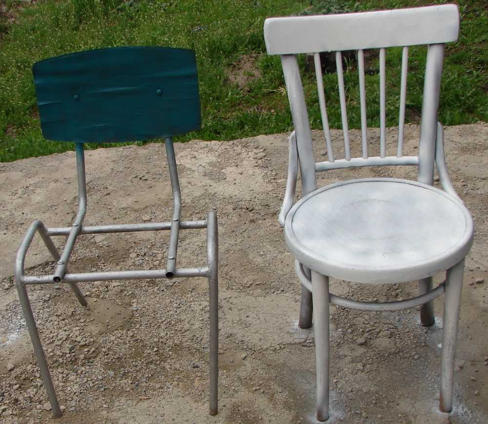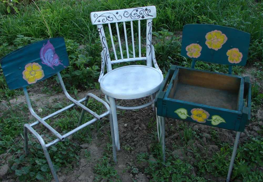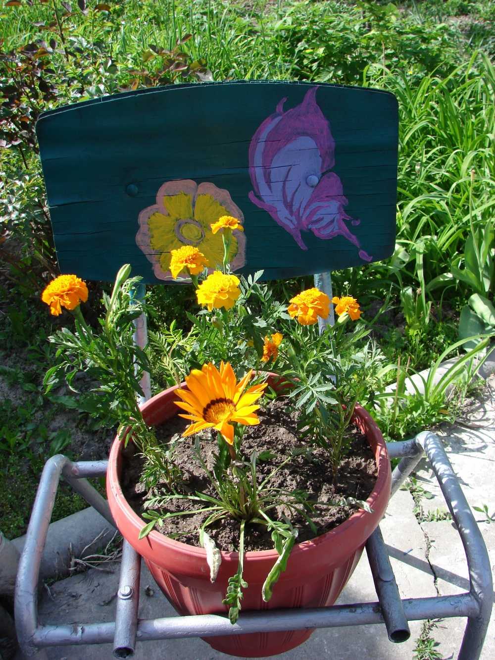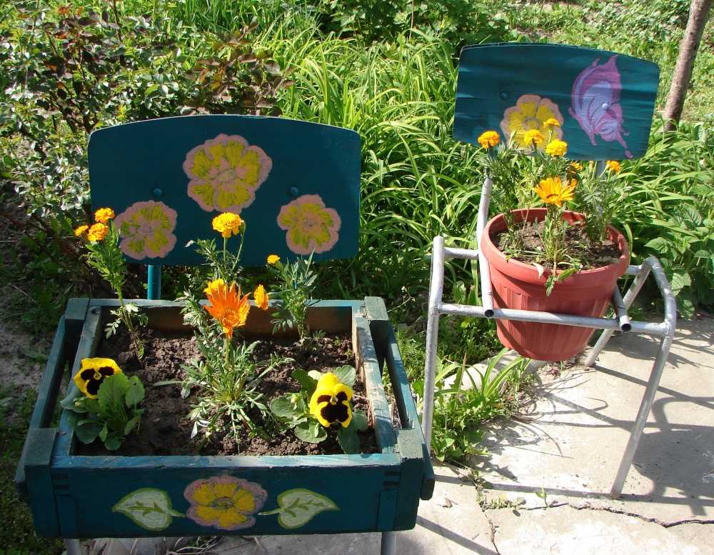 Все остальные материалы зависят исключительно от вашей фантазии. Можете, например, использовать деревянный ящик вместо горшка. В любом случае, вначале удалите старую краску со стульев и тщательно обработайте их наждачной бумагой.