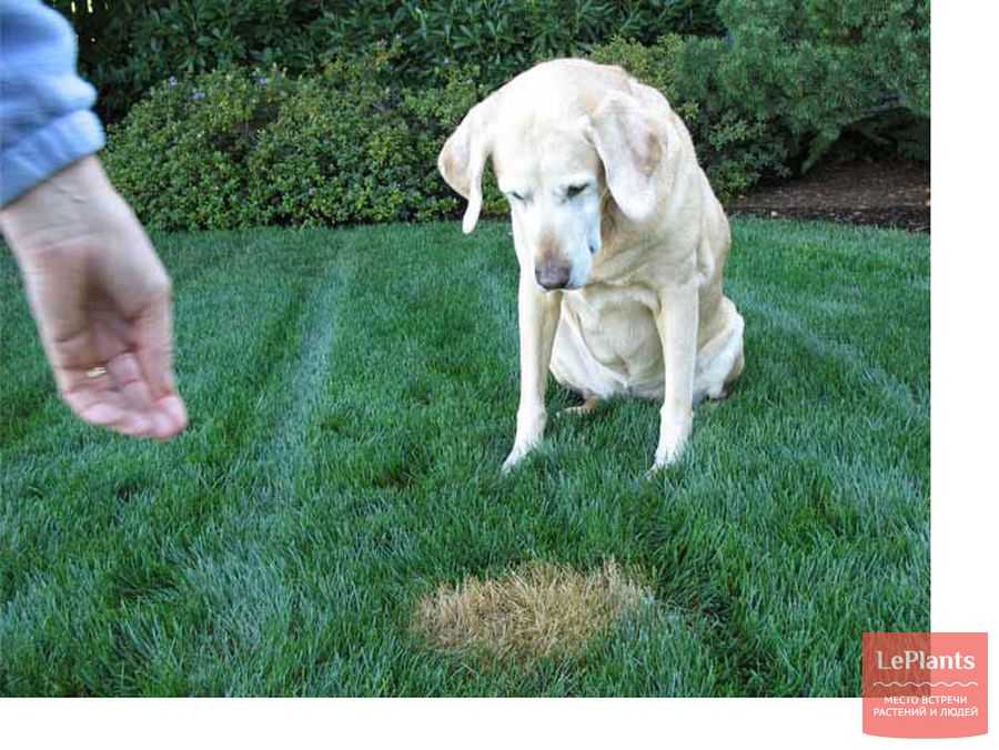 Напоследок добавим, что в последнее время причиной «выпадения» газона становятся домашние животные, особенно крупные собаки, которые незаметно от своих хозяев ходят по-маленькому на газон. Несколько таких случаев не приведут к серьезным последствиям, однако систематические «проливные дожди» от взрослого лабрадора сначала станут причиной бурного роста травы в этом участке. Но уже через неделю это место начнет желтеть, а отдельные кустики травы погибать от переизбытка мочевины (то, что принято называть «сжиганием» от удобрений). При этом края описанного участка всегда остаются зелеными — это визитная карточка данного явления.