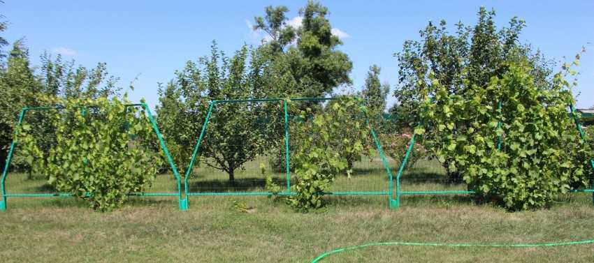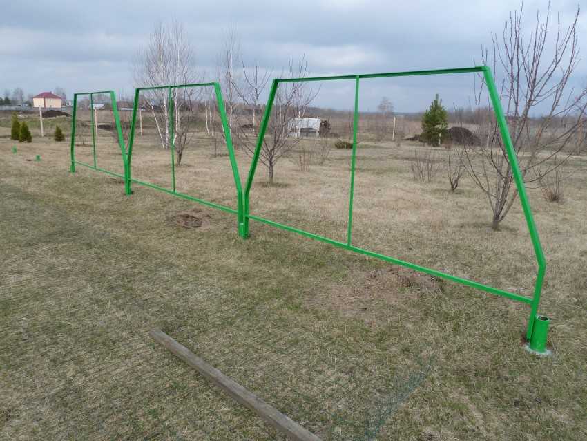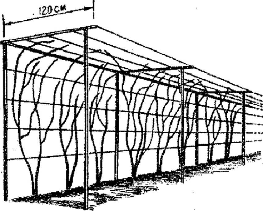 Высота стоящих вертикально опор – 2-2,5 метров, расстояние между ними – 3 метра. Первый ряд проволоки натягивают на высоте 40-50 см от поверхности почвы, далее ряды располагаются приблизительно на таком же расстоянии.