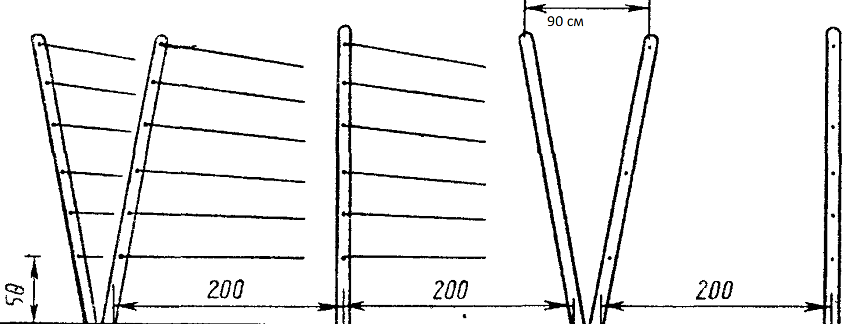 Размеры опор и расстояния между проволочными рядами точно такие же, как и у шпалер одной плоскости. Высота конструкции от земли – 2 метра, расстояние между столбами – 6-8 метров, а между рядами – 4-5 метров.
